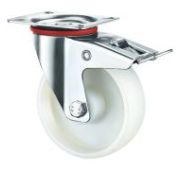 Колесная опора EMES EM04 ZKZ 125 устанавливается на платформенные тележки для пищевой промышленности, передвижное медицинское оборудование и технику. Нейлоновый обод хорошо распределяет нагрузку. Поворотный кронштейн изготовлен из оцинкованной стали. Тип крепления — под болт. Максимальная грузоподъемность модели составляет 160 кг. Рабочий температурный диапазон — от -20 до +70 °С.