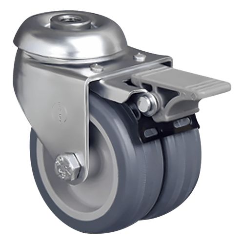 Данная сдвоенная аппаратная колесная опора предназначена для установки на торговое оборудование, больничную мебель, медицинскую аппаратуру и т. п. Контактный слой выполнен из серой резины, кронштейн — из оцинкованной стали. Модель имеет диаметр 50 мм, работает в температурном диапазоне от -20 до +60 °С. Грузоподъемность составляет 55 кг.