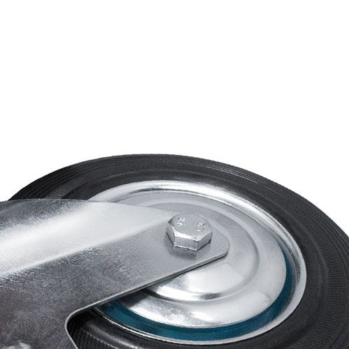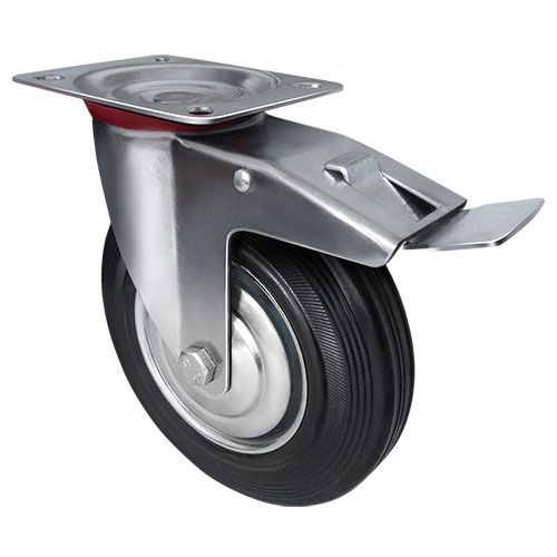 Колесо промышленное поворотное с тормозом SCB80 предназначено для мусорных контейнеров, промышленного оборудования, платформенных тележек, лесов и строительных вышек-тур. Шинка выполнена из литой, черной резины. Колесо имеет стальной оцинкованный обод. В оси установлен роликовый подшипник. Кронштейн с платформенным креплением изготовлен из оцинкованной стали. Отличается средней устойчивостью к воздействию химических веществ. Может передвигаться по грубой поверхности и эксплуатироваться в условиях влажной среды.
