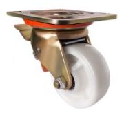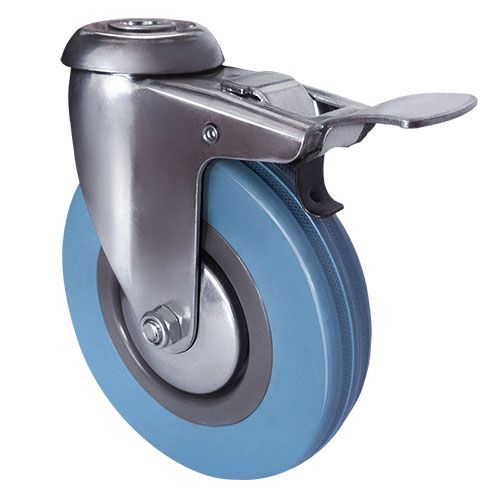 Колесо аппаратное поворотное под болт с тормозом SChgb 25 предназначено для легкого торгового, лабораторного, медицинского, гостиничного, офисного и складского оборудования. Шинка выполнена из термопластичной серой резины. В оси установлен подшипник скольжения. Кронштейн с креплением «под болт» изготовлен из оцинкованной стали. Полипропиленовый обод закрыт стальными кожухами. Не оставляет следов на напольных покрытиях. Отличается хорошими ходовыми качествами, повышенной маневренностью, низким уровнем шума, устойчивостью к внешним химическим воздействиям. Диапазон температур — от -35ºC до +60ºC.