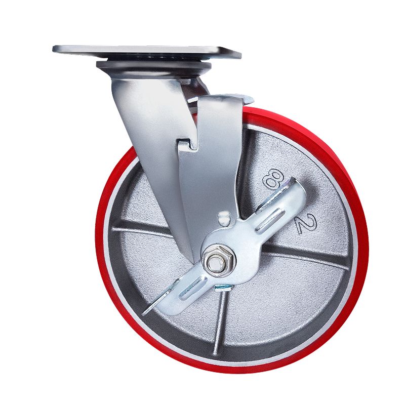 Колесо большегрузное полиуретановое поворотное с тормозом SCPB55 предназначено для оснащения складского, транспортного строительного оборудования и тяжелых механизмов. Шинка выполнена из полиуретана. Материал отличается высокой износостойкостью и большой грузоподъемностью. Колесо отлично переносит динамические, статические и ударные нагрузки, хорошо служит на любых твердых поверхностях. Обод выполнен из чугуна, оснащен роликовым подшипником в оси и смазочным ниппелем. В поворотном механизме установлен двухрядный шариковый подшипник с пресс-масленкой. Кронштейн — сварной, изготовлен из оцинкованной листовой стали. Диапазон температур — от -35ºC до +50ºC.