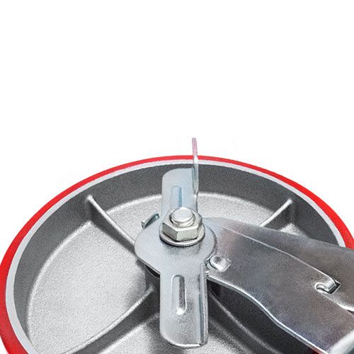 Колесо большегрузное полиуретановое поворотное с тормозом SCPB63 предназначено для оснащения складского, транспортного строительного оборудования и тяжелых механизмов. Шинка выполнена из полиуретана. Материал отличается высокой износостойкостью и большой грузоподъемностью. Колесо отлично переносит динамические, статические и ударные нагрузки, хорошо служит на любых твердых поверхностях. Обод выполнен из чугуна, оснащен роликовым подшипником в оси и смазочным ниппелем. В поворотном механизме установлен двухрядный шариковый подшипник с пресс-масленкой. Кронштейн — сварной, изготовлен из оцинкованной листовой стали. Диапазон температур — от -35ºC до +50ºC.